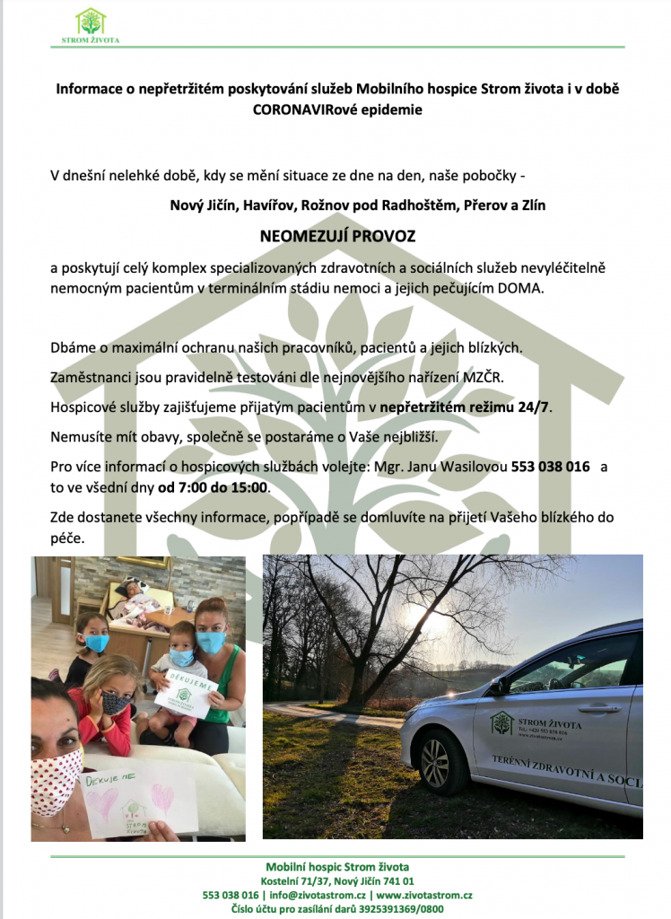 Informace o nepřetržitém poskytování služeb Mobilního hospice Strom života i v době CORONAVIRové epidemie