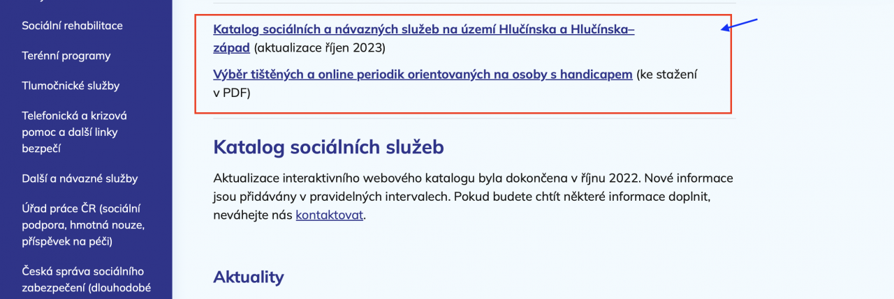 Katalog sociálních služeb si můžete stáhnout také v PDF verzi (➡️ označeno červenou šipkou), dále si jej třeba vytisknout a používat i v době, kdy nebudete mít příatup k počítači a internetu.