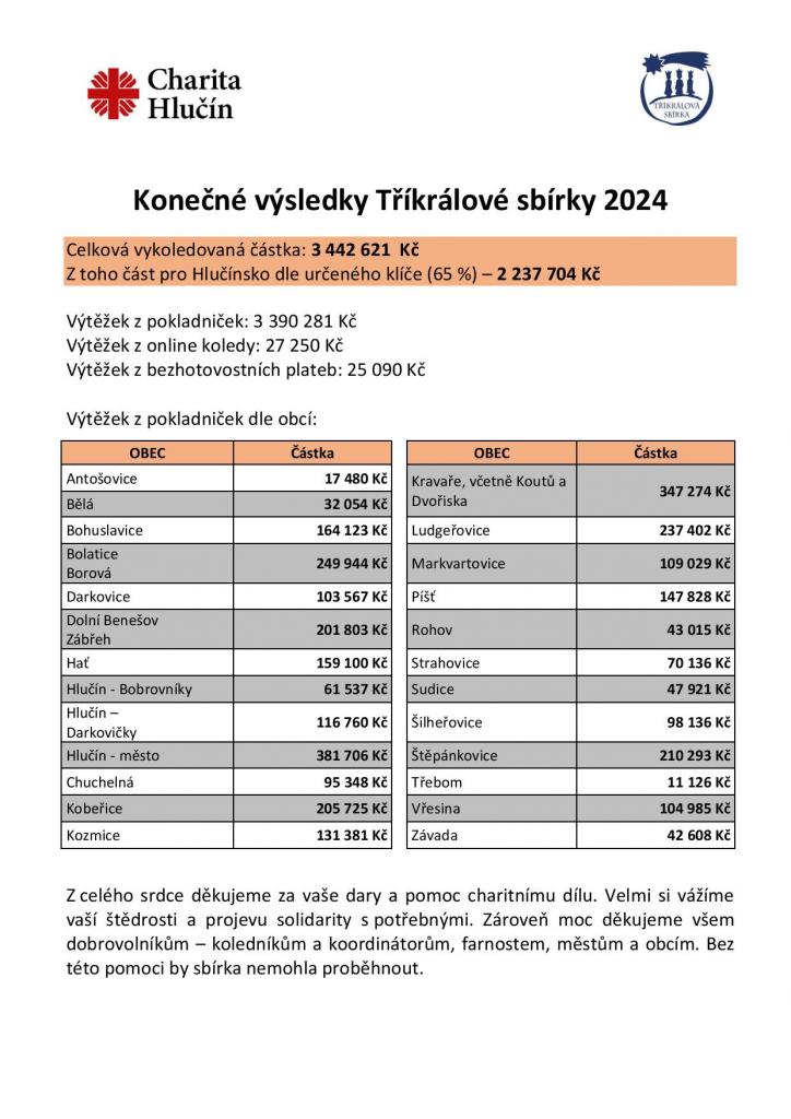 Letošní rok byl opět rekordním - na Hlučínsku (Charita Hlučín), v roce 2024 dárci přispěli úžasnou částku 3 442 621 Kč, z toho do tradičních pokladniček ohromných 3 390 281 Kč, zbývající částku 52 340 Kč lidé darovali online.