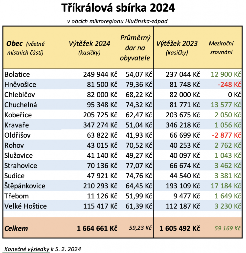 Konečné výsledky Tříkrálové sbírky jsou (jako každoročně) uveřejněny také na webových stánkách Charity Hlučín a Charity Opava, protože obce našeho mikroregionu jsou rozděleny do územní působnosti těchto dvou charit.