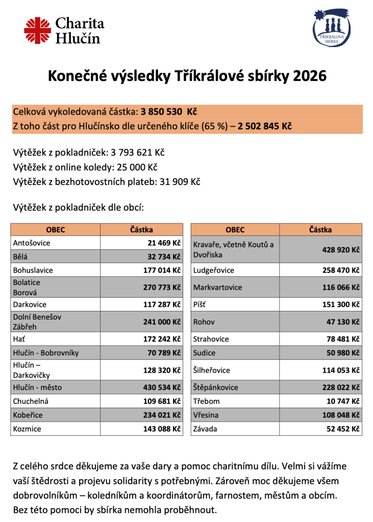 Konečné výsledky Tříkrálové sbírky budou (jako každoročně) uveřejněny také na webových stánkách Charity Hlučín a Charity Opava, protože obce našeho mikroregionu jsou rozděleny do územní působnosti těchto dvou charit.