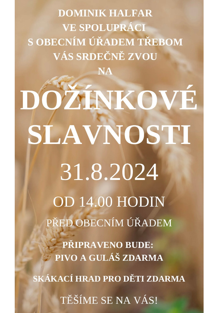 Jste srdečně zváni na Dožínkové slavnosti do Třebomi
