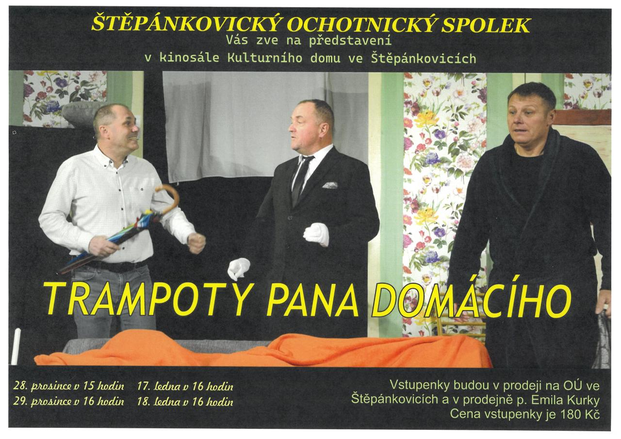 Štěpánkovický ochotnický spolek Vás zve na představení v kinosále Kulturního domu ve Štěpánkovicích. Představení se hraje ve dnech 28. a 29. prosince a 17. a 18. ledna. Cena vstupenky je 180 Kč. Vstupenky si můžete zakoupit na obecním úřadě ve Štěpánkovicích nebo v prodejně pana Emila Kurky.