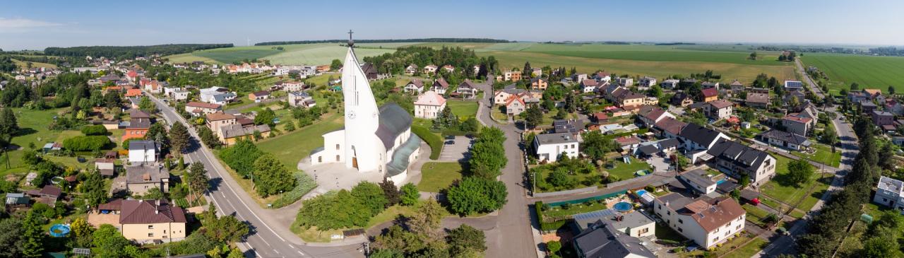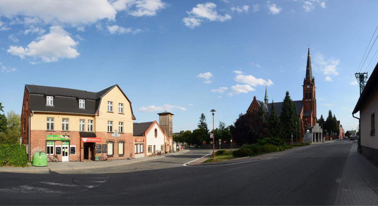 Kobeřice - křižovatka u kostela (ulice Slezská)